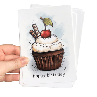 Obwohl sich die meisten Postkarten meiner Briefmarken-Kollektion durchaus zur Geburtstagspost eignen, fehlte mir irgendwie eine "richtige" Geburtskarte. Inspiriert von der Lieblingstorte meines Mannes entstand dieses Cupcake Motiv.
